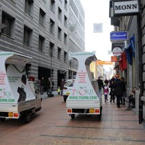 The small traveling advertisement that becomes big, because it reaches everywhere. In fact, he can travel along streets, lanes and alleys, avoiding the limitations subject to trucks. Another advantage of this vehicle is that it can be driven by a fourteen year old with a regular driving license. Double-sided panel in fiberglass with surface cm 140 x h 165.